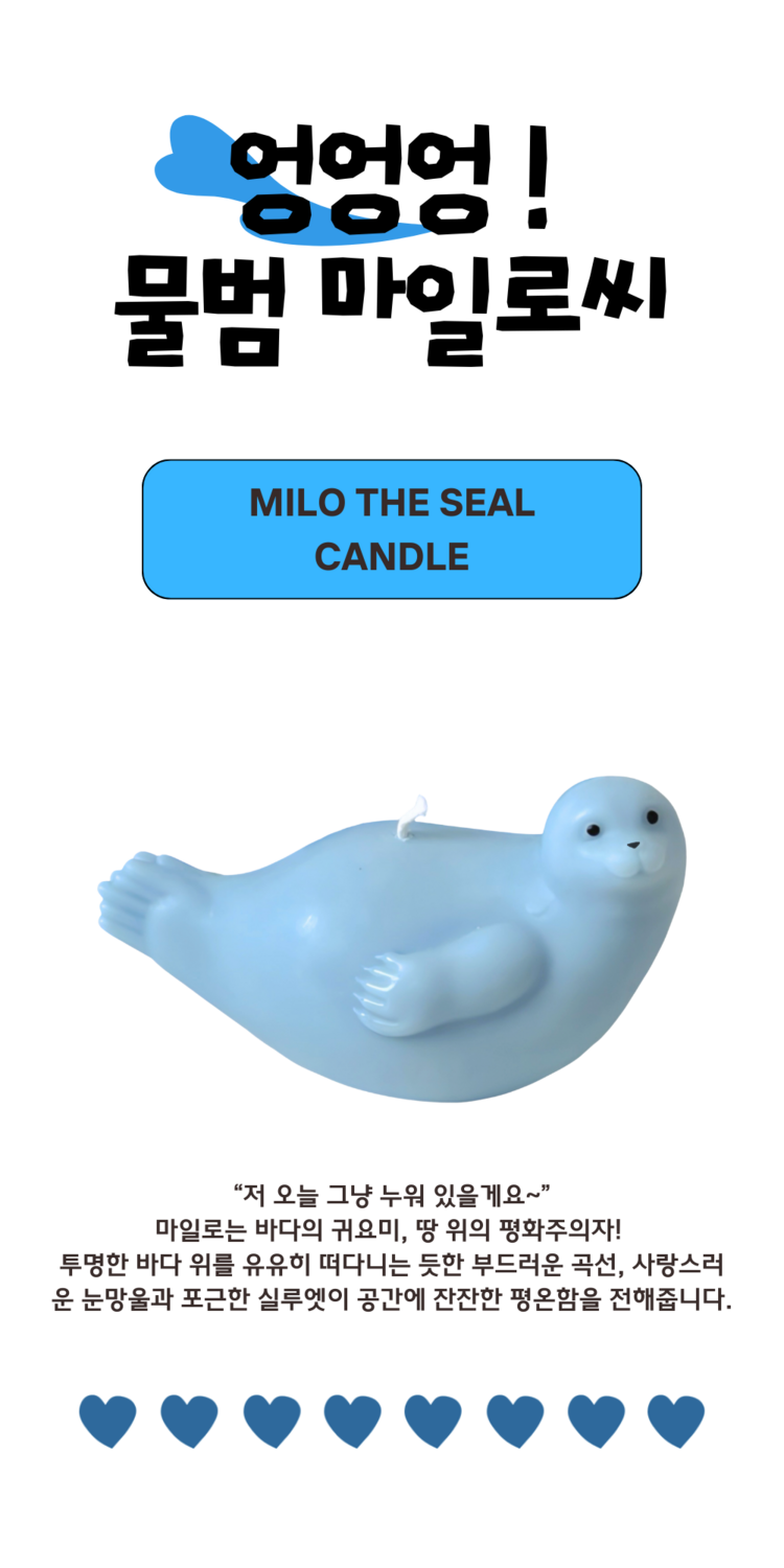 귀엽고 통통한 물범 마일로는 눈을 반짝이며 낮에도 멍하니 상상 속을 헤엄쳐요. 파도처럼 잔잔히 번지는 향과 함께, 당신의 하루에도 몽글몽글한 꿈을 띄워 보세요.