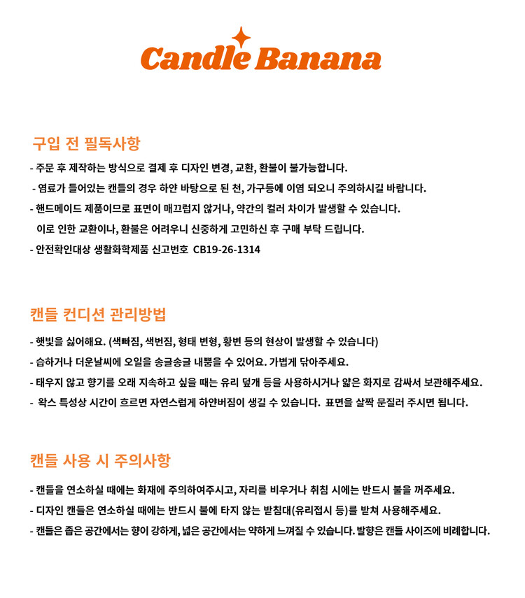 | 사용상 주의사항 | 반려동물과 어린아이 손이 닿지 않는 곳에 보관하시고, 3시간 이상 연소시 환기 시켜주세요. 캔들이 타는 동안 용기가 뜨거워질 수 있으니 주의하세요. 취침 또는 외출시 반드시 향초를 꺼주세요. 피부가 민감하거나 손상된 사람은 제품을 장기간 접촉하지 않도록 주의하시오. 불에 타지 않는 초 받침대를 사용하시오. |