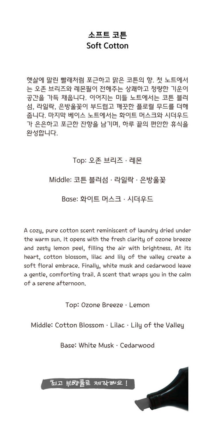 - 좁은 공간에서 발향력이 강하게 느껴지며, 넓은 공간에서 발향력은 약하게 느껴질수 있습니다.