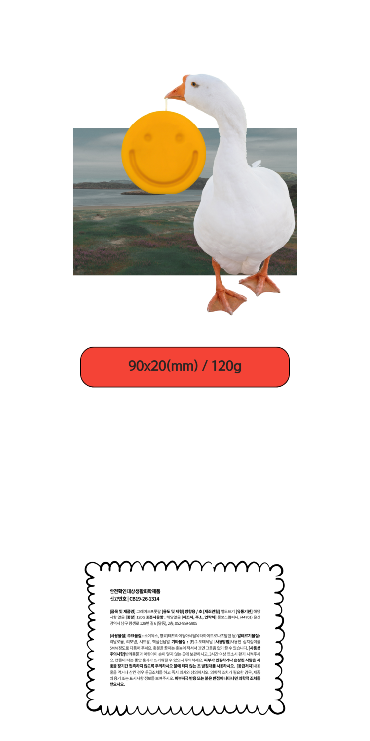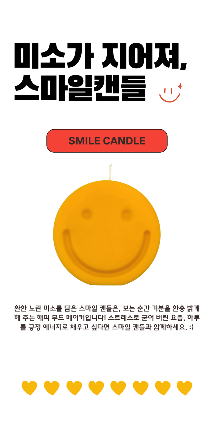 환한 노란 미소를 담은 스마일 캔들은, 보는 순간 기분을 한층 밝게 해 주는 해피 무드 메이커입니다! 스트레스로 굳어 버린 요즘, 하루를 긍정 에너지로 채우고 싶다면 스마일 캔들과 함께하세요 :)