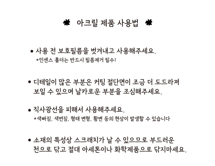 - 제품 특성상 단순 변심, 부주의에 의한 제품 손상 및 파손, 사용 및 개봉한 경우 교환/반품이 불가합니다.